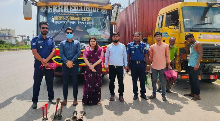এ সময় ৩টি যানবাহন থেকে ৩টি হাইড্রোলিক হর্ণ জব্দস ৬ হাজার টাকা জরিমানা আদায় করা হয়। অভিযানে নেতৃত্ব দেন এক্সিকিউটিভ ম্যাজিস্ট্রেট ও সহকারী কমিশনার (ভূমি) রহিমা আক্তার ইতি। অভিযানে সহায়তা করে বন্দর থানা পুলিশ ও পরিবেশ অধিদপ্তরের কর্মকর্তারা। প্রসিকিউশন প্রদান করেন পরিবেশ অধিদপ্তরের পরিদর্শক মো. হুজ্জাতুল ইসলাম।