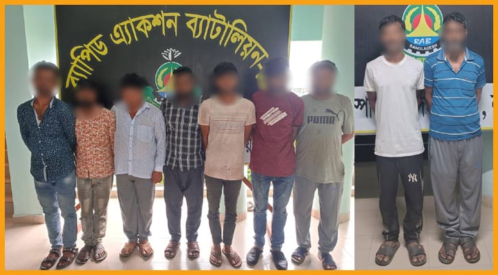 গ্রেফতারকৃতরা হলেন – মো. লিটন (৩৭), মো. আক্তার হোসেন (৪৪), মো. রোমান (৩২), মো. রফিকুল ইসলাম (২৮), সাইদুল ইসলাম (৩১), সাগর মুন্সি (৩৮), মো. আরিফ (২৬), মো. রিয়াজ (৩৮) ও মো. শহিদুল (৪০)।